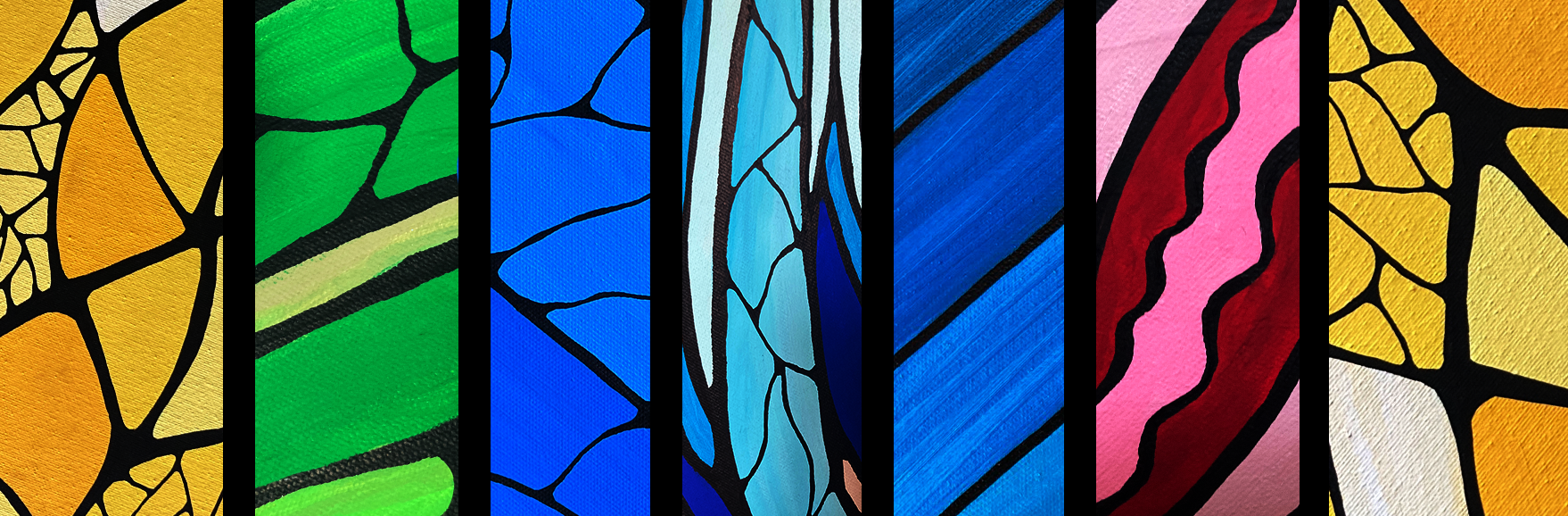 I invented this stained-glass style of abstract acrylic painting and work in it exclusively. Precise, fluid black lines divide color, unite subjects and flow independently, signaling universal connection and connecting to larger philosophical themes.